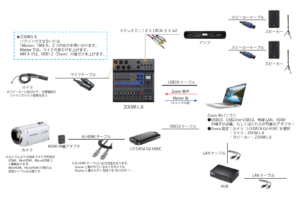 ですので会場では、メインのスピーカーから出す音と、Zoomへ返す音を分けて組んであげる必要があります。例えばこのような感じで、ミキサーを使ってN-1(マイナスワン)を構築してあげます。